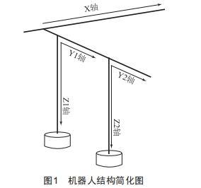 蓄電池極板連續(xù)生產(chǎn)線的碼垛機(jī)器人是一種特殊的直角坐標(biāo)搬運(yùn)機(jī)器人,本文以此種機(jī)器人為例,研究機(jī)器人控制方法。蓄電池極板連續(xù)生產(chǎn)線的特點(diǎn)是同時(shí)輸出兩垛料,需要機(jī)器人能同時(shí)將兩垛料取出并搬運(yùn)至目標(biāo)位置。傳統(tǒng)直角坐標(biāo)機(jī)器人三軸(x軸、Y軸、Z軸)的機(jī)械結(jié)構(gòu)顯然不能滿足這樣的應(yīng)用需求,因此設(shè)計(jì)了能滿足此種應(yīng)用需求的特殊機(jī)器人,機(jī)器人結(jié)構(gòu)簡(jiǎn)化如圖1所示。