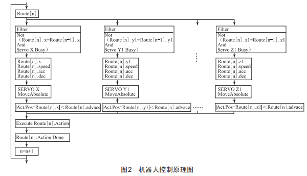 機(jī)器人的控制原理主要部分如圖2所示。執(zhí)行第I步時(shí),控制器向各個(gè)軸下發(fā)當(dāng)前步的運(yùn)動(dòng)控制命令:控制命令通過(guò)一個(gè)命令執(zhí)行過(guò)濾器(fi1ter),當(dāng)前軸上一步目標(biāo)位置和當(dāng)前步目標(biāo)位置一致,且前當(dāng)軸正在運(yùn)動(dòng)時(shí),則不執(zhí)行運(yùn)動(dòng)命令,否則執(zhí)行當(dāng)前步運(yùn)動(dòng)命令:當(dāng)所有軸的當(dāng)前位置距離目標(biāo)位置在軌跡控制精度(advance)范圍內(nèi)時(shí),則認(rèn)為當(dāng)前步位置命令完成,開(kāi)始執(zhí)行當(dāng)前步動(dòng)作命令:當(dāng)前步動(dòng)作命令執(zhí)行完成后,開(kāi)始執(zhí)行下一步運(yùn)動(dòng)命令。