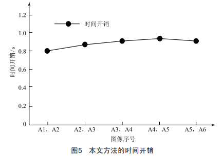 另外,圖3描述的場(chǎng)景1由+幅圖像為基礎(chǔ)拼接而成,本文方法拼接圖像的時(shí)間開銷如圖5所示。圖5中,本文方法拼接5個(gè)輸電線路場(chǎng)景圖像的時(shí)間開銷均在0.841.0s,各幅圖像拼接的時(shí)間差較小,用時(shí)較短。上述數(shù)據(jù)顯示,本文方法拼接輸電線路走廊全景圖像的用時(shí)短,在全景展示輸電線路走廊方面效率較高。
