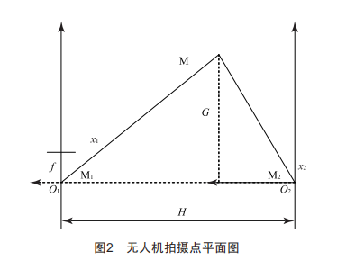 圖像空間的M點(diǎn)投影分別用M1與M2表示,圖2中描述的圖像拍攝位置是無(wú)人機(jī)的水平方向保持不變,M1與M2的橫坐標(biāo)分別用x1與x2表示,/是拍攝焦距,兩個(gè)拍攝點(diǎn)的中心距離用H