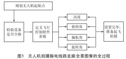 本次研究采用大疆品牌無(wú)人機(jī)配合Dronepan飛行控制軟件共同操縱無(wú)人機(jī)飛行狀態(tài),無(wú)人機(jī)拍攝參數(shù)設(shè)置如下:設(shè)置延遲拍攝時(shí)間為1.5s,根據(jù)需求飛行高度最高可達(dá)130m:無(wú)人機(jī)拍攝的圖像分辨率為4000×3000dpi,焦距為18mm,偏航角與俯仰角分別為45●、22.5●:在水平方向分四行進(jìn)行拍攝,每行拍攝8張圖像,垂直方向拍攝35張圖像,拍攝行數(shù)為1行。圖1展示了無(wú)人機(jī)拍攝輸電線路走廊全景圖像的全過(guò)程。