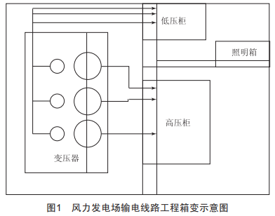 箱變安裝是風(fēng)力發(fā)電場輸電線路工程施工中的重要環(huán)節(jié),在設(shè)備運(yùn)到現(xiàn)場后,技術(shù)人員要結(jié)合箱變示意圖(圖1)核對產(chǎn)品信息,確保其容量、電壓等級等數(shù)據(jù)符合設(shè)計(jì)需求。技術(shù)人員要結(jié)合"拆卸件一覽表"進(jìn)行核對,保證變壓器的主機(jī)及附件完好,要利用16t的調(diào)車進(jìn)行安裝,在基礎(chǔ)施工養(yǎng)護(hù)完成后,結(jié)合中心線位置,將其吊運(yùn)到基礎(chǔ)上,將其與基礎(chǔ)的預(yù)埋件進(jìn)行焊接,提出兩根扁鐵,與接地設(shè)置連接。