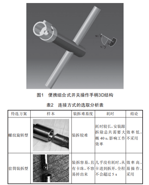根據(jù)操作手柄連接方式的選取分析表(表2)所示,本設(shè)計(jì)選擇套筒裝拆型的連接方式。