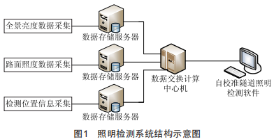 照明檢測(cè)系統(tǒng)結(jié)構(gòu)如圖1所示。(1)實(shí)現(xiàn)車載全景亮度計(jì)對(duì)隧道路面亮度值的采集工作并進(jìn)行數(shù)據(jù)庫(kù)存儲(chǔ):(2)實(shí)現(xiàn)多點(diǎn)隧道路面照度信息的采集工作并進(jìn)行數(shù)據(jù)庫(kù)存儲(chǔ):(3)實(shí)現(xiàn)所采集數(shù)據(jù)與采集點(diǎn)位置信息一一對(duì)應(yīng):(4)根據(jù)同一位置全景亮度信息和照度信息進(jìn)行建模,去除偏離點(diǎn),得到亮度與照度信息轉(zhuǎn)換函數(shù),可對(duì)數(shù)據(jù)進(jìn)行二次校準(zhǔn),達(dá)到隧道照明數(shù)據(jù)快速檢測(cè)、相對(duì)穩(wěn)定可靠、標(biāo)準(zhǔn)均一的目的:(5)完成隧道照明智能檢測(cè)系統(tǒng)軟件,使其具備自校準(zhǔn)功能,可生成全隧道照度信息分布表,多次測(cè)量可得出燈具衰耗曲線。