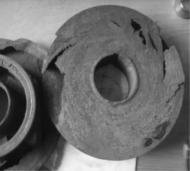 經(jīng)長周期運(yùn)行,#2供油泵兩側(cè)軸承座水平振動(dòng)均達(dá)到0.1mm,伴有異音。解體檢查發(fā)現(xiàn),首級導(dǎo)葉定位銷脫落,導(dǎo)葉旋轉(zhuǎn)、導(dǎo)葉與中段軸向間隙0.5mm左右,推力側(cè)滑動(dòng)軸承軸瓦磨損、脫胎,如圖2所示,首級葉輪磨損,如圖3所示,平衡軸套磨損,泵軸彎曲度0.12mm。