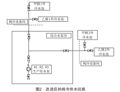 建議更改給水管道設(shè)計(jì),使生產(chǎn)水泵出水經(jīng)不同的管道分別給4個極補(bǔ)水。但由于土建工程已完工,再從水泵房敷設(shè)管道至閥冷設(shè)備間工程量較大,因此可在各極的閥冷設(shè)備間生產(chǎn)給水管道處增加手動閥門,使4個極的外冷補(bǔ)水相對獨(dú)立,如圖2所示。這樣雖然兩個極在水泵房到閥冷設(shè)備間仍共用管道,但從閥冷設(shè)備間到外冷水池這一段管道已相互獨(dú)立。
