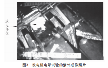 2015年2月,#2發(fā)電機(jī)交流耐壓試驗(yàn)時(shí),A相升壓到17kV后,汽側(cè)端部電暈放電聲音較大,升壓至22kV后,放電聲音增大,伴有放電現(xiàn)象。通過紫外成像儀檢測(cè)結(jié)果如圖3所示,原因分析:發(fā)電機(jī)定子線棒防電暈層存在斷裂現(xiàn)象,進(jìn)行交流耐壓試驗(yàn)時(shí),存在放電現(xiàn)象,經(jīng)專家確認(rèn)重新涂刷了低阻漆及絕緣漆烘干后,電暈試驗(yàn)合格,耐壓試驗(yàn)合格。