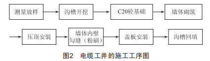 如圖2所示,電纜工井施工分為測(cè)量放樣、溝槽開挖、C20碎基礎(chǔ)、墻體砌筑、壓頂安裝、墻體內(nèi)壁勾縫(粉刷)、蓋板安裝、溝槽回填等工序,每項(xiàng)工序都有嚴(yán)格的作業(yè)流程和質(zhì)量要求,同時(shí),施工完成后進(jìn)行考核,達(dá)到工程要求標(biāo)準(zhǔn),方能進(jìn)入下一流程。新藥創(chuàng)制中心配電房工程的高壓負(fù)荷開關(guān)柜與變壓器都在高壓柜電室,因此兩者是經(jīng)過電纜形成通路,其中開關(guān)柜接線方式為上進(jìn)上出,設(shè)置專用孔用于電纜穿過,完成后再將孔封閉。同時(shí),柜體與母線在金屬內(nèi)完全封閉。施工前,需要確認(rèn)元件型號(hào)、電壓、電源等匹配,型號(hào)與設(shè)計(jì)一致。在施工現(xiàn)場(chǎng)需要安裝的二次線主要為計(jì)量、電容柜、接地及電氣互鎖部分的接線。此部分接線按照不同電壓等級(jí)、交流、直流線路區(qū)分,綁扎成束,且有標(biāo)記。二次回路控制線采用多股軟銅線,接線端子采用規(guī)格合適的閉口接線端子,使用專用壓線鉗壓接。