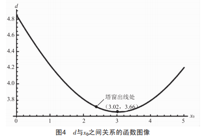 d與x0之間的關(guān)系如圖4所示,分析圖像可知,導(dǎo)線離開(kāi)塔窗后與塔身的距離先減小后增大,導(dǎo)線與鐵塔最近點(diǎn)并不在塔窗出線處而是在導(dǎo)線離開(kāi)塔窗后。出現(xiàn)這一情況是因?yàn)閷?dǎo)線離開(kāi)塔窗的一小段距離內(nèi),由于與臨塔高差大,下壓嚴(yán)重,垂直方向距離增加的幅度大于水平方向,因此導(dǎo)線與塔身距離越來(lái)越小,到達(dá)極值點(diǎn)后由于水平方向距離增加的幅度大于垂直方向,導(dǎo)線逐漸遠(yuǎn)離桿塔,因此距離增大。極小值點(diǎn)坐標(biāo)為(3.02,3.66),鐵塔瓶口電氣間隙為3.66m,小于帶電檢修工況所需滿足的3.7m電氣間隙。因此,用空間幾何算法校驗(yàn)鐵塔瓶口電氣間隙的結(jié)論為間隙不滿足要求。