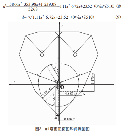 式中,h為瓶口高差:m為塔窗寬度的1/2:丑為導(dǎo)線懸掛點(diǎn)高差,比鄰塔高時(shí)為正,比鄰塔低時(shí)為負(fù):1為檔距:/x為瓶口小弧垂:K為該耐張段的K值。