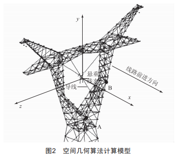 圖2所示為建立鐵塔、V型絕緣子串和導(dǎo)線的三維模型,通過(guò)模型分析可知,塔身與導(dǎo)線最近的點(diǎn)在下曲臂內(nèi)側(cè)主材上,求解鐵塔瓶口電氣間隙可轉(zhuǎn)換成求解導(dǎo)線與空間直線AB的最小距離。