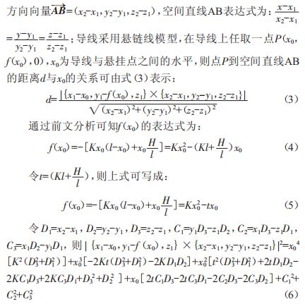 (1)本文通過(guò)空間三維算法提出鐵塔瓶口電氣間隙和導(dǎo)線與懸掛點(diǎn)之間水平距離的關(guān)系,可用一元二次方程表示,發(fā)現(xiàn)導(dǎo)線離開(kāi)塔窗后電氣間隙先減小后增大,與塔身最小距離出現(xiàn)在導(dǎo)線離開(kāi)塔窗后的一小段距離之內(nèi),求取鐵塔瓶口電氣間隙即為求取一元二次方程的最小值。