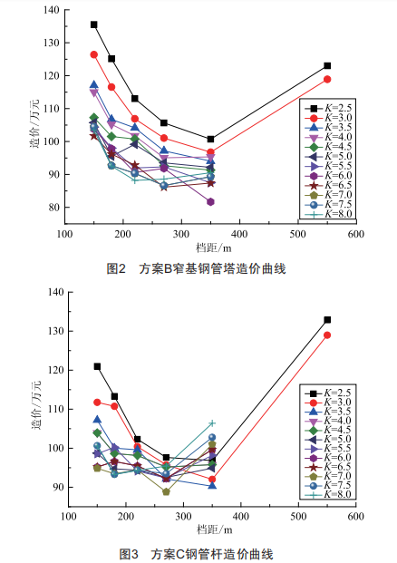 對于方案C,當(dāng)導(dǎo)線安全系數(shù)K=7時,檔距為350m造價最低,是最經(jīng)濟的。