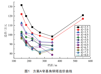 當(dāng)導(dǎo)線安全系數(shù)較小時,導(dǎo)線弧垂較小,可以使用呼高較小的塔,但與此同時,導(dǎo)線運行張力較大,使得耐張塔增重明顯。當(dāng)導(dǎo)線安全系數(shù)較小時,相同檔距下導(dǎo)線弧垂較大,為了滿足安全距離要求,需要使用呼高較大的塔,或減小使用檔距,這也是通常鋼管桿規(guī)劃安全系數(shù)大、檔距小的原因。使用較小的檔距,也意味著使用更多的桿塔,這無疑會增加工程造價。因此,需要對不同導(dǎo)線安全系數(shù)下的架線立塔方案進行比選,本文對導(dǎo)線安全系數(shù)K=2.5~8(步長=0.5)下的12種排塔方案進行比較,以得到適用于窄基桿塔的最優(yōu)安全系數(shù)。