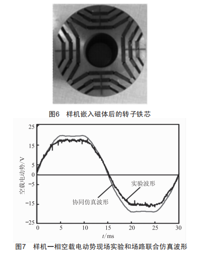 1kw鐵氧體伺服電機樣機(以下簡稱樣機)主要技術(shù)數(shù)據(jù)如表1所示。圖6是樣機嵌入鐵氧體磁鋼后的轉(zhuǎn)子鐵芯實物照片,圖7為樣機一相空載電動勢的現(xiàn)場實驗和場路聯(lián)合仿真波形。