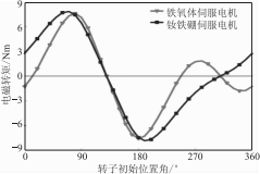 當(dāng)鐵氧體伺服電機靜態(tài)轉(zhuǎn)矩曲線出現(xiàn)多個極值點時,難以實現(xiàn)電機啟動時的準(zhǔn)確定位,使電機啟動困難。圖1是應(yīng)用有限元軟件掃描得到的欽鐵硼伺服電機和鐵氧體伺服電機的靜態(tài)轉(zhuǎn)矩曲線,可見欽鐵硼伺服電機只有一個極值點,而鐵氧體伺服電機有兩個極值點,前者可以實現(xiàn)電機啟動時的準(zhǔn)確定位,后者的定位則比較困難。