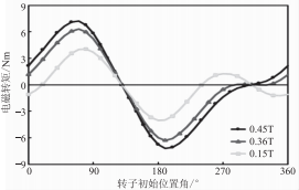 然而集中繞組鐵氧體伺服電機靜態(tài)轉(zhuǎn)矩曲線是否出現(xiàn)多個極值點則與永磁磁鏈大小有關(guān)。圖4為6極/9槽集中繞組鐵氧體伺服電機的仿真模型,圖5給出了不同永磁磁鏈時6極/9槽集中繞組鐵氧體伺服電機的靜態(tài)轉(zhuǎn)矩仿真曲線。當(dāng)永磁磁鏈ψpm<0.36wb時,電機靜態(tài)轉(zhuǎn)矩曲線出現(xiàn)了兩個極值點,且永磁磁鏈越低,極值轉(zhuǎn)矩越大:當(dāng)ψpm≥0.36wb時,只剩下一個極值點。顯然,鐵氧體伺服電機存在一個臨界永磁磁鏈ψpmcr,本文ψpmcr=0.36wb,當(dāng)ψpm<ψpmcr,靜態(tài)轉(zhuǎn)矩曲線會出現(xiàn)兩個極值點,當(dāng)ψpm≥ψpmcr,靜態(tài)轉(zhuǎn)矩曲線只有一個極值點。
