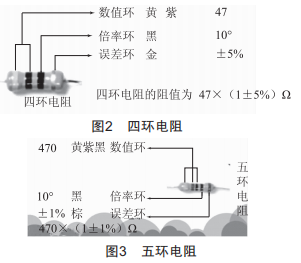 色碼法是根據(jù)色環(huán)電阻表面的顏色來(lái)識(shí)別電阻阻值。四環(huán)電阻阻值的識(shí)別方法:四環(huán)電阻前兩環(huán)代表的是數(shù)值環(huán),第三環(huán)代表的是倍率環(huán),最后一環(huán)代表的是誤差環(huán)。從四環(huán)電阻的識(shí)讀上升到五環(huán)電阻的識(shí)讀,符合建構(gòu)主義規(guī)律。這里主要講解的是四環(huán)電阻和五環(huán)電阻每一環(huán)代表含義的相同之處和不同之處,不同之處是四環(huán)電阻前兩環(huán)代表數(shù)值環(huán),而五環(huán)電阻前三環(huán)代表數(shù)值環(huán)。相同之處是,四環(huán)電阻、五環(huán)電阻倒數(shù)第二環(huán)和最后一環(huán)分別代表倍率環(huán)和誤差環(huán)。結(jié)合色碼法,圖2、圖3為四環(huán)電阻和五環(huán)電阻,四環(huán)電阻的阻值是47Ω,誤差土5%:五環(huán)電阻的阻值是470Ω,誤差士1%。色環(huán)電阻的識(shí)別方法同樣適用于色環(huán)電容的識(shí)讀。