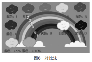 恰好生活中彩虹的顏色與色環(huán)電阻顏色代表的數(shù)值很相近,如圖6所示,這個(gè)方法也能使學(xué)生快速記憶色環(huán)電阻顏色代表的數(shù)值,經(jīng)過(guò)教學(xué)實(shí)踐,效果非常好,可以使學(xué)生在沒(méi)有色環(huán)電阻阻值表的情況下快速識(shí)別出色環(huán)電阻的阻值。