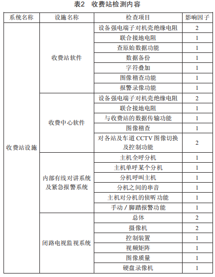 車道檢測(cè)內(nèi)容如表1所示。收費(fèi)站檢測(cè)內(nèi)容如表2所示。