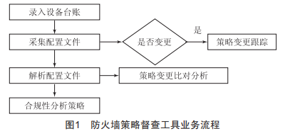 防火墻策略督查工具主要通過系統(tǒng)在線采集并解析防火墻設備配置文件,生成防火墻策略。在采集數(shù)據(jù)的基礎上,對防火墻的配置變更進行跟蹤,對策略進行比對分析及策略合規(guī)性分析。其具體業(yè)務流程如圖1所示。