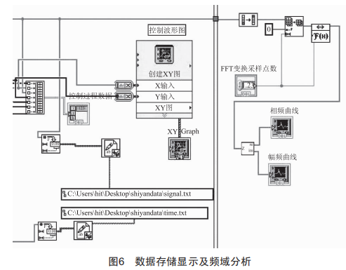 當電壓信號滿足自動停止條件后控制程序停止,控制過程數(shù)據(jù)將通過創(chuàng)建數(shù)組存儲在計算機指定位置以便分析,信號通過運算處理可得到其頻域波形,如圖6所示。最后將程序復位,整個程序運行完畢。試驗過程中所有的波形均可以在前面板中觀察,如圖7所示。
