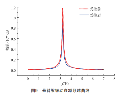 試驗開始前預先打開光源,對PLZT進行預照射,使光壓電達到飽和值,運行程序,對懸臂梁進行激振,使其產(chǎn)生周期性振動,試驗測得的在受控前后懸臂梁自由端振動衰減曲線對比如圖8所示。