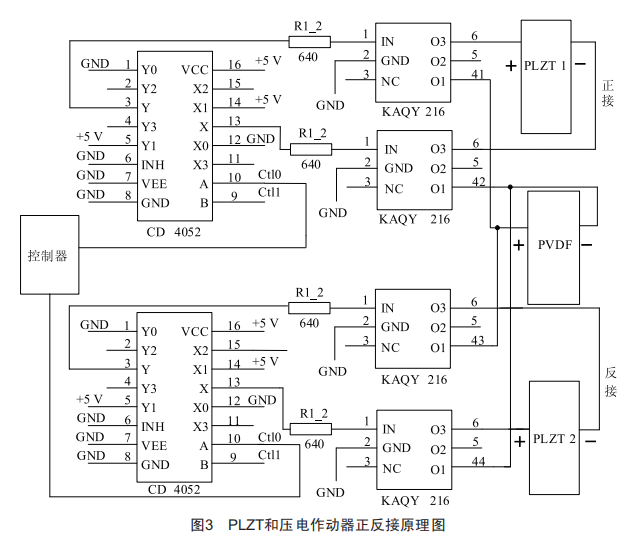 控制雙PLZT與壓電作動器連接的開關(guān)電路如圖3所示。當控制器輸出上方電路控制信號為1、下方電路控制信號為0的信號時,PLZT與壓電作動器正接,壓電作動器得正電:當控制器輸出上方電路控制信號為0、下方電路控制信號為1的信號時,PLZT與壓電作動器反接,壓電作動器得負電:當控制器為兩路均提供控制信號0,則PLZT與壓電作動器斷開。