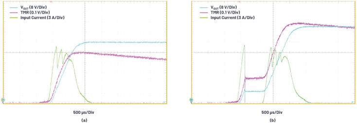 圖2.LTC4381 10 A保險絲電路采用(a) 48 V(左)和(b) 60 V(右)電源啟動220 μF負載電容