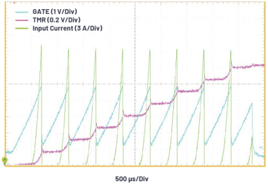 圖1中的電路主要用于保護上游電源,無論是在啟動或正常運行期間,保護電源不受過載和短路等下游故障影響。圖5顯示在輸出端存在短路時,LTC4381啟動其MOSFET。柵極電壓(藍色曲線)升高。超過3 V閾值電壓時,MOSFET開啟,電流(綠色曲線)開始流動。由于輸出短路,且沒有柵極電容,MOSFET電路迅速升高,超過0 V輸出時的15.5 A電流限值閾值,并在LTC4381做出反應(yīng),下拉MOSFET柵極和關(guān)斷電流流動之前達到21 A峰值。電流超出15.5 A的時間持續(xù)不到50 μs。由于MOSFET中短暫的功耗,TMR電壓(紅色曲線)升高約200 mV。由于TMR遠低于1.215 V柵極關(guān)斷閾值,柵極再次打開,導(dǎo)致出現(xiàn)另一個電流尖峰。在每一個電流尖峰位置,TMR電壓升高至接近1.215 V。