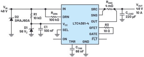 LTC4381的內(nèi)部功率MOSFET為48 V、10 A系統(tǒng)的電子保險絲或斷路器提供緊湊電路。如此,在設(shè)計階段無需花費時間選擇功率MOSFET。LTC4381 MOSFET的SOA經(jīng)過生產(chǎn)測試,每個器件都可以保證質(zhì)量,分立式MOSFET不提供這種保證。這有助于構(gòu)建一個可靠的解決方案,以保護服務(wù)器和網(wǎng)絡(luò)設(shè)備中價格昂貴的電子裝置。
