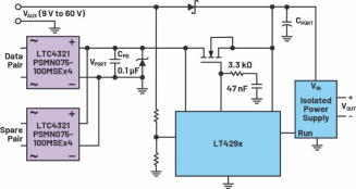 一種潛在的PoE解決方案如圖11所示。該解決方案包括LT4321橋控制器,它使得MOS晶體管可以用作理想的二極管,而不是整流器,其優(yōu)點在于可以大幅提高效率。其后接LT4295,這是一個符合802.3bt標準的PD器件。還可以后接合適的本地穩(wěn)壓器,以滿足之前的表中所示的要求,按照需要提供高達90+ W的功率。