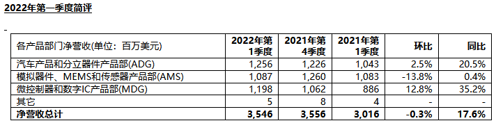 ? “第一季度凈營收35.5億美元,毛利率46.7%,高于我們業(yè)務(wù)展望的中位數(shù)。這一營收業(yè)績得益于微控制器市場的強(qiáng)勁需求,雖然我們的中國深圳工廠因疫情而短期停產(chǎn)對本期營收也構(gòu)成了一定影響。