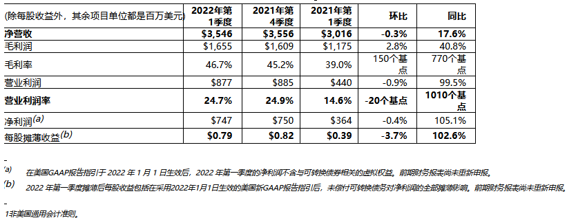 營業(yè)利潤提高 99.5%,達(dá)到8.77億美元,去年同期為4.40億美元。營業(yè)利潤率占至凈營收24.7%,比2021年第一季度14.6%同比提高1,010個基點(diǎn)。