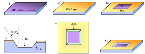 首先,在硅晶圓上加工微孔不是件容易的事。硅硬度大且脆,而需要加工的孔徑小且量大,用傳統(tǒng)的機械加工方式根本不可行。在1958年肖特基的專利中,他提出了用晶料界面的化學腐蝕速率的差異來實現(xiàn)微孔的刻蝕 (因為歷史久遠加上缺少足夠資料,未能完全理解肖老的這種腐蝕方法*_*)。
