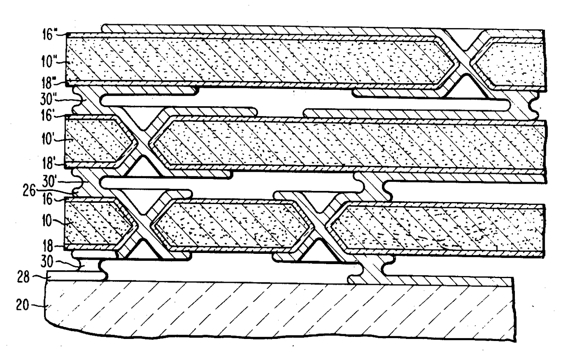 6年之后的1964年,IBM申請了一項專利(METHODS OF MAKING THRU- CONNECTIONS IN SEMICONDUCFOR WAFERS),提出了利用在通孔中做簡并摻雜降低電阻的方式實現(xiàn)硅片的垂直互連,即用低阻硅為導電材料。但是這項專利還只是停留在硅片自身上下表面器件的,并沒有用于多芯片的堆疊。直到5年后的1969年,IBM才在另一項專利 (HOURGLASS-SHAPED CONDUCTIVE CONNECTIONTHROUGH SEMCONDUCTOR STRUCTURES) 中首次提出了基于垂直互連的多層芯片的堆疊,如下圖: