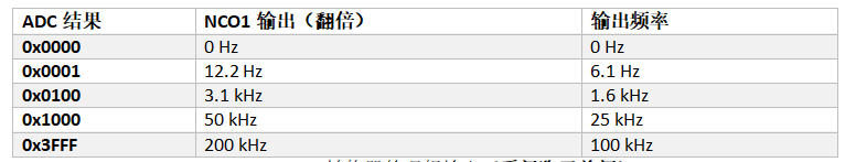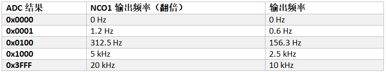 在該示例中,已將NCO2設(shè)置為在內(nèi)部創(chuàng)建所需的輸入時(shí)鐘頻率,以通過14位輸入獲得100 kHz輸出。之所以使用14位結(jié)果,是因?yàn)锳DCC本身的12位結(jié)果不足以在沒有外部時(shí)鐘源的情況下產(chǎn)生100 kHz輸出。