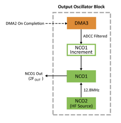 輸出振蕩器模塊的核心是數(shù)控振蕩器(NCO)。NCO外設(shè)的工作原理是在輸入時(shí)鐘的上升沿向累加器添加增量值,然后根據(jù)累加器溢出導(dǎo)出外設(shè)的輸出。(有關(guān)NCO的完整說明,請參見數(shù)據(jù)手冊。)