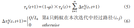公式(5)、公式(6)中,p為信息素濃度衰減系數(shù),0為信息素強(qiáng)度,Lk為第k只螞蟻在本次迭代搜索中走過的路徑長度。