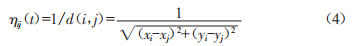 公式(3)中,allowdedi為與柵格i鄰接的自由柵格集合,a為柵格i至柵格i路徑上殘留的信息素,α、8分別為信息素濃度啟發(fā)因子和能見度啟發(fā)因子,n為路徑能見度函數(shù),其取值由公式(4)獲得:
