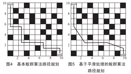 仿真實(shí)驗(yàn)參數(shù)需滿足:種群數(shù)量m=100,迭代次數(shù)N=200,信息素權(quán)重參數(shù)a=1,啟發(fā)因子權(quán)重參數(shù)8=7,信息素強(qiáng)度系數(shù)0=200,信息素?fù)]發(fā)系數(shù)p=0.8,分別對(duì)基本蟻群算法和加入平滑處理策略的蟻群算法進(jìn)行仿真驗(yàn)證,得到機(jī)器人運(yùn)動(dòng)規(guī)劃