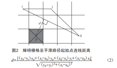 本文采取通過刪除拐彎點(diǎn)、拉直運(yùn)動(dòng)路徑或緩解急拐彎的方式來平滑機(jī)器人運(yùn)動(dòng)路徑,具體措施為:障礙柵格至平滑路徑起始點(diǎn)連線距離如圖2所示,現(xiàn)有搜索路徑i→j→k,出現(xiàn)拐彎點(diǎn)j。假設(shè)a、b分別為柵格編號(hào)i、j、k三者的最小值和最大值,搜索柵格編號(hào)子集L=(a,a+1,a+2,…,b}中的障礙柵格p,按照公式(2)計(jì)算柵格p到柵格i與柵格k中心連線的距離d,若d≤6,則可以刪除拐彎柵格j,拉直柵格i和柵格k,以此達(dá)到平滑運(yùn)動(dòng)路徑的目的。