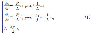 式中,id、iq、ud、uq為d、g軸上的定子電流與電壓:W為機(jī)械角速度:R為定子電阻:1為永磁磁鏈:J為調(diào)速系統(tǒng)等效轉(zhuǎn)動(dòng)慣量。