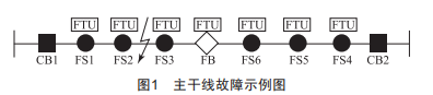 主干線故障示例如圖1所示。動作過程及保護配合:(1)主干線發(fā)生故障:(2)變電站CB1開關跳閘,重合不成功:(3)主站通過線路的遠方監(jiān)控單元檢測到FS1、FS2開關有故障電流,而FS3開關沒有,判斷出故障點在FS2~FS3:(4)主站通過自動遙控或人工方式斷開FS2、FS3開關,隔離故障區(qū)域:(5)通過遠方監(jiān)控單元上傳的故障信息判斷,調(diào)度員可遙控合上變電站CB1開關,恢復前段非故障區(qū)域送電:(6)調(diào)度員通過人工方式遙控合上FB開關,恢復后段非故障區(qū)域送電:(7)故障處理完畢后,由人工操作,恢復線路正常運行方式。