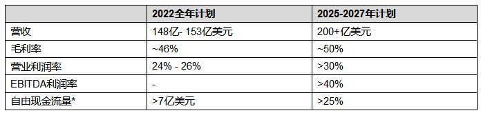 下表為與公司先前披露的 2022全年?duì)I收計(jì)劃相關(guān)的財(cái)務(wù)預(yù)期,以及昨天在資本市場(chǎng)日會(huì)議上分享的 2025-2027年新目標(biāo)。