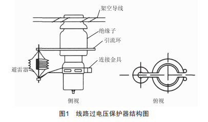 線路過電壓保護器限流元件通過連接金具固定在瓷橫擔上,引流環(huán)套在橫擔上,與導線直接形成間隙,其結構如圖1所示。雷擊時,引流環(huán)與架空線路間的空氣間隙被擊穿,此時過電壓保護器殘壓被限制在一定范圍,避免絕緣子閃絡。其安裝過程不需去除導線絕緣層,所以導線不存在防水問題且施工方便,避雷器本體不承受系統(tǒng)電壓。該設備不僅適用于架空絕緣導線,也適用于架空裸導線。但基于引流環(huán)的結構設計,只能安裝于直線桿橫擔上。