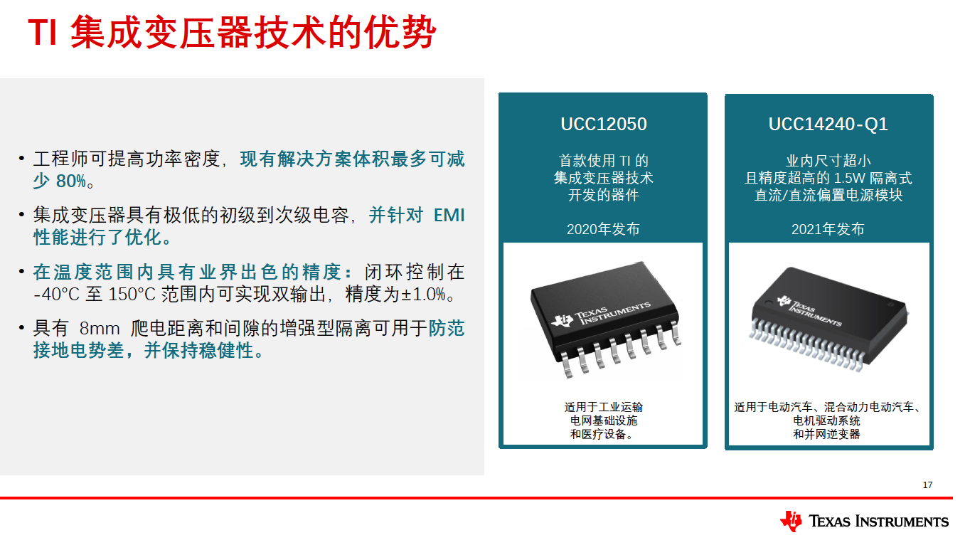 UCC12050是首款首款使用TI 的集成變壓器技術(shù)開發(fā)的器件,發(fā)布于2020年。UCC14240-Q1是業(yè)內(nèi)尺寸超小且精度超高的1.5W 隔離式直流/直流偏置電源模塊,發(fā)布于2021年。