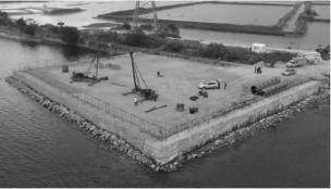 塔位基礎(chǔ)采用灌注樁基礎(chǔ),灌注樁施工期間產(chǎn)生的污染物主要是施工過程中產(chǎn)生的鉆渣、懸浮泥沙(泥漿)、施工機(jī)械的油污。施工過程中為避免產(chǎn)生的懸浮物及溢油等污染物對(duì)水質(zhì)及海洋生物造成影響,施工前通常在塔基海域搭建臨時(shí)施工平臺(tái)。臨時(shí)施工平臺(tái)采用1:6的水泥砂加適量水機(jī)械攪拌后裝入尼龍袋壘砌,并填砂沖水密實(shí),臨時(shí)施工平臺(tái)斷面如圖1所示。臨時(shí)施工平臺(tái)現(xiàn)場圖如圖2所示。