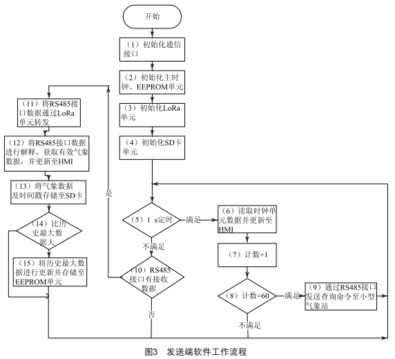 采集節(jié)點(diǎn)既要完成采集氣象站的數(shù)據(jù),也需通過LoRa無線網(wǎng)絡(luò)上傳和接收數(shù)據(jù)及命令。發(fā)送端軟件工作流程如圖3所示,分為兩大部分:(1)判斷主時(shí)鐘1S定時(shí),讀取主時(shí)鐘單元數(shù)據(jù)并更新至HMI,累計(jì)記時(shí)達(dá)到60S后通過RS485接口發(fā)送查詢氣象信息命令至小型氣象站;(2)當(dāng)RS485接口接收到氣象站數(shù)據(jù)時(shí),首先將數(shù)據(jù)通過LoRa單元轉(zhuǎn)發(fā)至接收裝置,隨后將數(shù)據(jù)進(jìn)行解釋,獲取有效氣象信息,并更新至HMI,將氣象及時(shí)間數(shù)據(jù)存儲(chǔ)至SD卡后與歷史數(shù)據(jù)做比較,將最大值更新并存儲(chǔ)至EFPROM單元。