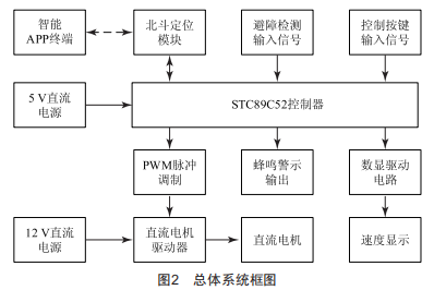 該行李箱控制執(zhí)行系統(tǒng)主要由STC89C52單片機、直流電機驅(qū)動器、直流電機、同步帶、同步輪等組成,達到調(diào)速驅(qū)動的目的。同時該控制執(zhí)行系統(tǒng)具備北斗導(dǎo)航定位模塊、超聲波障礙探測及警示模塊、數(shù)顯驅(qū)動電路模塊。其控制執(zhí)行系統(tǒng)的總體系統(tǒng)框圖如圖2所示。